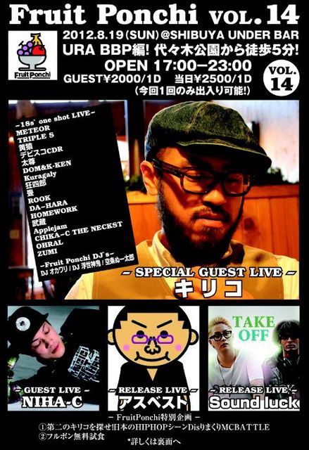 開催終了Fruit Ponchi VOL.14出演者発表!キリコ、NIHA-C、アスベスト、Sound luck!拡散希望!