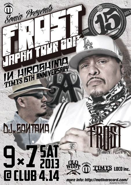 2013年9月、広島に旋風が巻き起こる! WEST COASTを語る上で決して避けては通れない男、 CHICANO、LOWRIDER界の大御所、FROSTが2年ぶりに来日決定!! 広島が誇るLOWRIDER CAR SHOP「TIMYS」15周年を記念しSONIAと共に堂々開催致します!! 数々の歴史、音楽を届けてきたFROSTのLIVEはまさに圧巻! 現地の風で、フロアが震撼する事間違いないでしょう!!