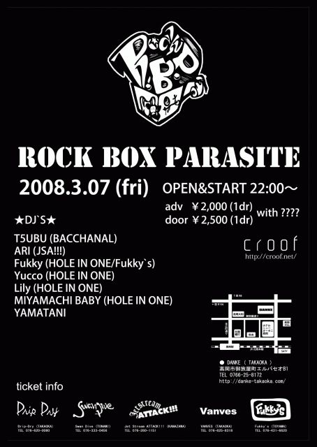 Ticket info Drip-Dry (高岡) TEL 0766-20-0080 Swan Dive (砺波) TEL 0763-33-0456 Jet Stream ATTACK!!! (金沢) TEL 076-260-1151 Vanves (高岡) TEL 0766-25-8318 Fukky's (富山) TEL 076-431-6620