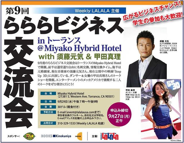 元格闘家の須藤元気さんが10月2日土曜日にハリウッドのFord Amphitheater で行われるJ.U.i.C.E Hip Hop Dance FestivalにWorld OrderとStep Up 2/3Dに出演した甲田真理さんa.k.a Jenny Kidoと 踊ります。その数日前にはWeekly LALALA主催のビジネス交流会にて須藤元気さんのトークショーも行われます。皆さんそろってご参加下さい。会場はトーランスのミヤコハイブリットホテルです。