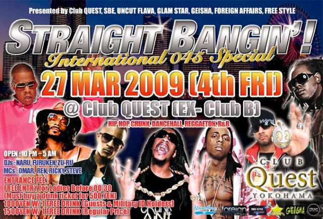 開催終了横浜Club QUEST、女性入場無料(12時半まで、500円で1ドリチケを購入要)!!今週の金曜日夜(3月27日)、最も熱いパーティーSTRAIGHT BANGIN’開催!