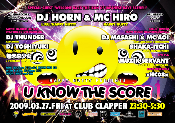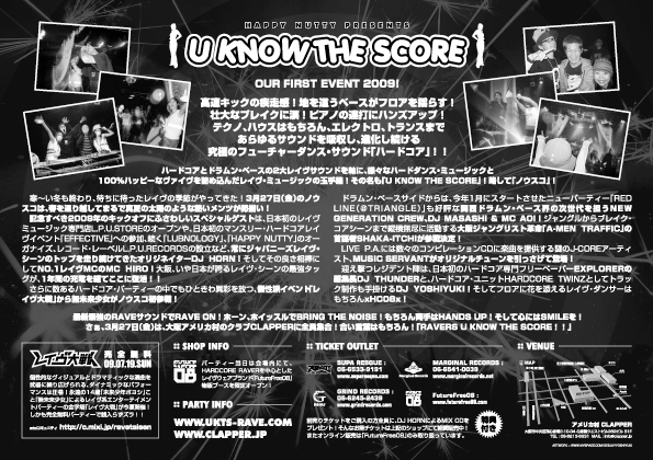 最新最強のRAVEサウンドでRAVE ON! ホーン、ホイッスルでBRING THE NOISE! もちろん両手はHANDS UP!そして心にはSMILEを! さぁ、3月27日(金)は、大阪アメリカ村のクラブCLAPPERに全員集合! 合い言葉はもちろん!「RAVERS U KNOW THE SCORE!!」