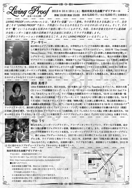 LIVING PROOFとは、"生きている証"という意味。今の世界を生きる私達にとって、自分達こそがLIVING PROOFであり、子供達にいろんなものを伝えていかなければいけません。そしてその中で"歌"というものは最も伝承されて後世に残っていくものです。今回、日本の音楽文化の中でも最高峰の女性アーティスト3組を大阪の北摂地方である池田にお招きしてライヴを開催します。この夢のコラボレーションを体験出来る人こそ、まさにLIVING PROOFといえるでしょう。