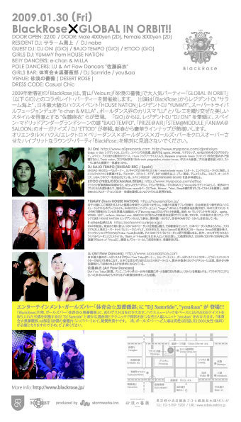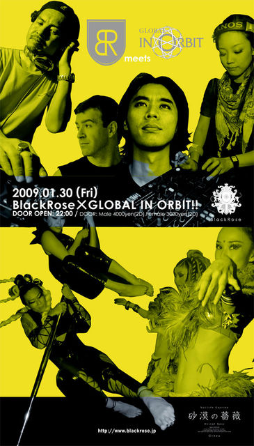 ★ 2009.01.30 (Fri) BlackRose meets GLOBAL IN ORBIT!! ★ 2009年新春初の「BlackRose」は、青山「Velours」「砂漠の薔薇」で大人気パーティー「GLOBAL IN ORBIT」(以降、GIO)とのコラボレイト・パーティーを開催致します。 出演は「BlackRose」からレジデントDJ "サラーム海上"、日本最大級のハウスイベント「HOUSE NATION」レジデントDJ "YUMMY"、スーパートライバルフュージョンデュオ "e-chan & MILLA"、ポールダンス界のカリスマ "LU " とバレエを織り交ぜた美しいスタイルを得意とする "佐藤麻衣" らが登場。 「GIO」からは、レジデントDJ "DJ ONI" を筆頭に、スペイン・マドリッドアンダーグランドシーンの雄 "BAJO TEMPO"、「PRIZE@AIR」「STEM@MODULE」「ANIMA@SALOON」のオーガナイズ / DJ "ETTOO" が参戦。新春から豪華ラインナップが勢揃いします。オリエンタル×ハウス/エレクトロ×ベリーダンス×ポールダンス×ガールズ・バーをクロスオーバーさせたハイブリットなラウンジ・パーティ「BlackRose」を絶対に見逃さないでください。 http://www.blackrose.jp/