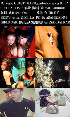 ■BlackRose http://www.blackrose.jp/ 2007年10月よりスタートし、銀座「砂漠の薔薇」で毎月最終金曜日に開催されているレギュラーパーティー「BlackRose」。オリエンタル×ハウス/エレクトロ×ベリーダンス×ポールダンス×ガールズ・バーをクロスオーバーさせたハイブリットなパーティー。「Blacklist」「Ooooze」「24K」など東京有数の人気パーティーとコラボレイトやイビザ、スロバキアなど海外から旬な実力派ガールズDJを奨励するなど、常に東京ラウンジシーンに新鮮な話題を提供している。 Black Rose is a regular party held onthe last Friday every month at Sabaku No Bara in Ginza. With theOriental taste as a basic tone, it is a hybrid party combining housemusic_electro_belly dance_pole dance_girls’ bar. Black Rosecollaborates with well-known popular parties held in Tokyo such as“Black list”, “Ooooze” and “24K”, promotes rising skilled girls DJsfrom Ibiza, Slovakia and other overseas countries, and provides variousother up-to-date topics to the Tokyo lounge scene.