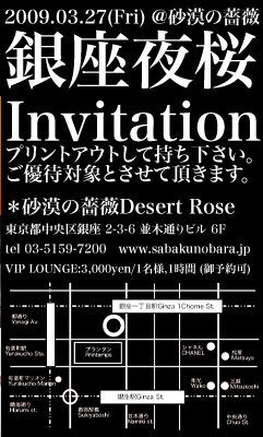 ★2009.03.27 (Fri) "銀座夜桜" BlackRose feat. GLOBAL IN ORBIT 昨年に続き、桜をテーマに銀座でラウンジパーティを開催する事となりました! 画像をプリントアウトしてお持ち下さい。2000yen/1Dの特別料金でご入場頂けます。今回も絶対に見逃せない内容です。花金の銀座でお花見しましょう!