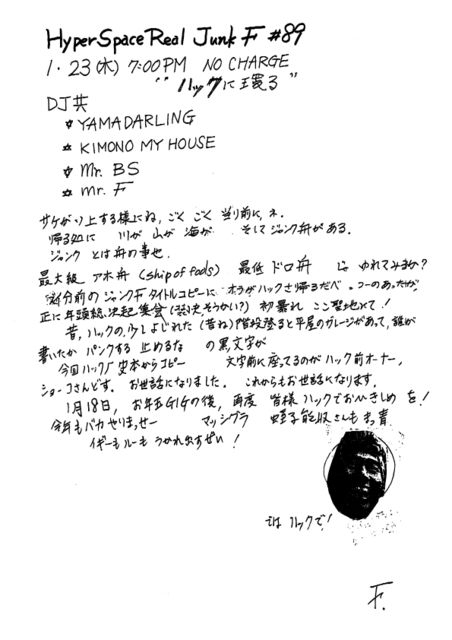 Sound Selectors: ◎ DJ Mr. F (New Wave; Post-Punk; Novelty; Showa Kayo; etc.) ◎ DJ Kimono My House (Power Punk; Hard Core Punk) ◎ DJ Yamadarling (Rare Groove; R&B; Classic Rock; etc.)