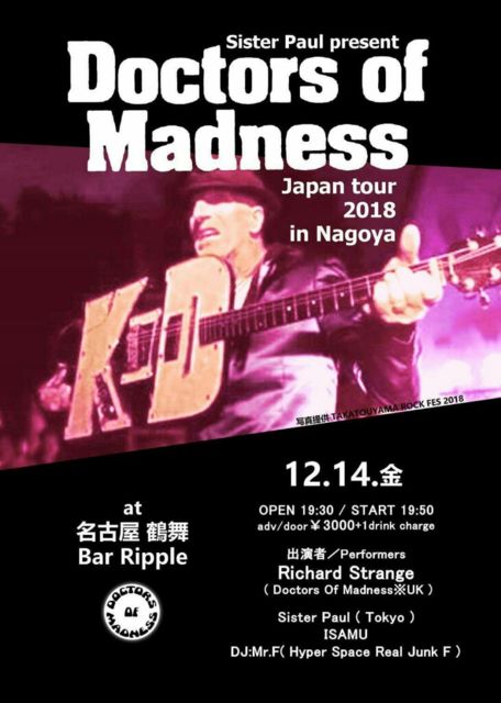 ±Ñ¹ñ¤è¤ê"¶¸µ¤¤Î°å»ÕÃÄ"Doctors Of Madness¤¬ºòǯ9·î¡¢º£Ç¯9·î¤Ë³¤ºÆ¤ÓÍèÆü¡¢Íè̾¡¢Íè±é¡£ DJ¤ÏÌÞÏÀMr.F¡ª ¢¢12/14(¶â) ¡ØSister Paul present Doctors Of Madness Japan tour 2018 in Nagoya¡Ù @ÄáÉñ¡ÖBAR Ripple¡×̾¸Å²°»ÔÃæ¶è¿·±É2¡¾47¡¾5 (JRÃæ±ûÀþ¡ÖÄáÉñ¡×(ÄáÉñ¸ø±à¸ý)¡¦Ãϲ¼Å´ÄáÉñÀþ¡ÖÄáÉñ¡×£½Ð¸ý¤è¤êËÌ(Àé¼ïÊýÌÌ)¤ØÅÌÊâ15ʬ¡£/JRÃæ±ûÀþ¡ÖÄáÉñ¡×(̾Âçɱ¡¸ý=Ë̸ý)¤è¤êƱ10ʬ¡£/¡ÖÀéÁá¡×¸òº¹ÅÀÅì¡¢¡Ö¥¹¥Ý¥ë¥È̾¸Å²°¡×΢¡¢JR¹â²Í²¼) O/S 19:30/19:50 Charge 3000±ß(+1D) ¡¾Performers¡¾ Richard Strange(Doctors Of Madness¢¨UK) Sister Paul(Tokyo) O.A:ISAMU DJ:Mr.F(Hyper Space Real Junk F)