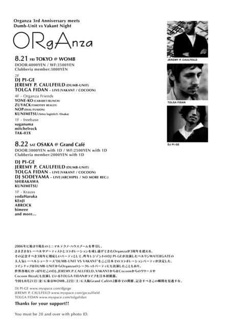 ■freebase We are freebase team. 音楽と共に遊ぶ事をベースに 常に楽しむ事に新しさを追求してる者同士が、 互いの持つ異なる要素をスパイスとし DJとパーティーという表現のツールにより融合させ 新しい変化の中で生まれるより洗練された要素にフォーカスをあてる。 更にオーディエンスとミックスされる事によって起こる、より大きな化学反応で パワーを得るこれぞパーティー!なる物を目指す。 様々な要素を取り込み常に変化をし続けるフレキシブルでラディカルなスタイルは、 次世代パーティーカルチャーのトランスフォーマー的役割として無限の可能性に挑戦していく。 今回WOMB1Fというラボラトリーで更なる新たな変化を試みる。