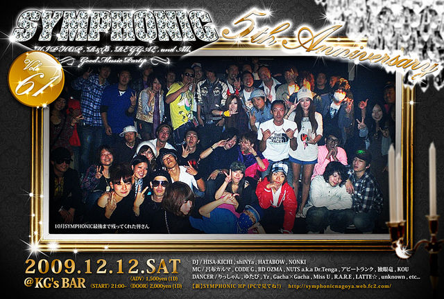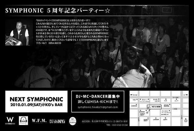 9:00〜9:40 DJ NONKI 9:40〜10:20 DJ HATABOW 10:20〜11:05 DJ MOTOKI 11:05〜11:40 LIVE1(4組) 11:40〜0:00 DANCE1(4組) 0:00〜0:40 DJ HISA-KICHI 0:40〜0:45 SYMPHONIC ALLSTARS RAP 0:45〜1:10 LIVE2(3組) 1:10〜1:35 DANCE2(5組) 1:35〜2:20 DJ shiNYa 2:20〜2:50 LIVE3(3組) 2:50〜3:30 DJ NONKI 3:30〜4:00 DJ HATABOW 4:00〜4:30 DJ MOTOKI 4:30〜LAST DJ shiNYa