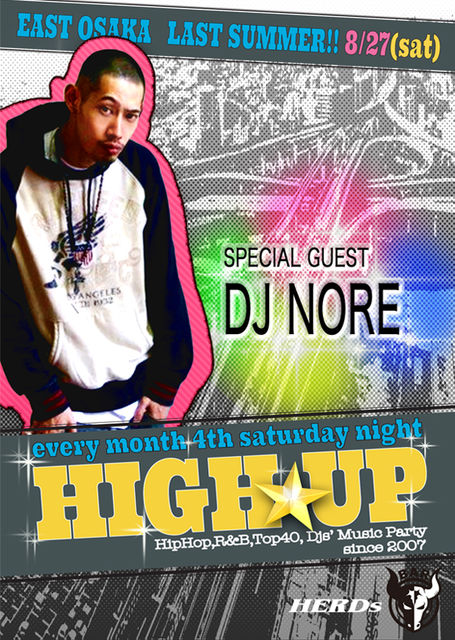 グランドオープンもつかの間、皆様のおかげで大盛況でしたが 8月はゲストDJを招いての更にスペシャル仕様です! 8.27(SAT)は最後の夏に東大阪のHIGH UPで大騒ぎです!!! ゲストDJに大阪はミナミの夜を連日騒がせているDJ NORE!!!!! 8.27(土)は東大阪の夜がマチガイナイ! 集まれ東大阪!!!Don't miss it!!!!!!!!!!