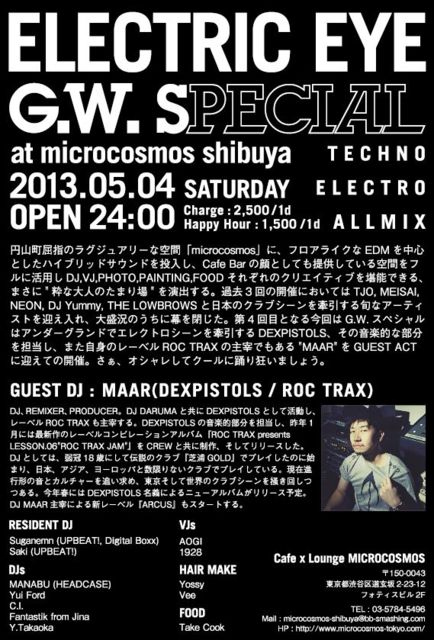 円山町屈指のラグジュアリーな空間「microcosmos」に、フロアライクなEDMを中心としたハイブリッドサウンドを投入し、Cafe Barの顔を持ち合わせた空間をフルに活用し、DJ,VJ,PHOTO,PAINTING,FOODそれぞれのクリエイティブを堪能できる、まさに"粋な大人のたまり場"を演出する。過去3回の開催においてはTJO, MEISAI, NEON, DJ Yummy, THE LOWBROWSと日本のクラブシーンを牽引する旬なアーティストを迎え入れ、大盛況のうちに幕を閉じた。第4回目となる今回はG.W.スペシャルはアンダーグランドでエレクトロシーンを牽引するDEXPISTOLS、その音楽的な部分を担当し、また自身のレーベルROC TRAXの主宰でもある"MAAR"をGUEST ACTに迎えての開催。さぁ、オシャレしてクールに踊り狂いましょう。