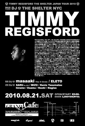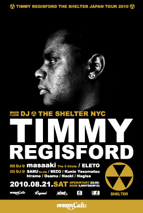 TIMMY REGISFORD & THE SHELTER THE SHELTERは、THE LOFT、THE GALLERY、PARADISE GARAGEやZANZIBARといった伝説的クラブと同様、DJとクラウドがある種の特殊な絆で結ばれた独特の雰囲気、ヴァイブが存在する希有なクラブである。1970年代前半から続くN.Y.クラブ史に於いて16年もの間存続し続けているという事実が、いかにこのクラブがスペシャルなものであるかということを如実に物語っている。 THE SHELTERの核となった人物、それはDJであり主宰者であるティミー・レジスフォードだ。彼は1980年代中頃より音楽制作を開始し、ボイド・ジャービスと共に数々のガラージ・クラシックスの名曲を生み出す。やがてN.Y.のラジオ・ステーション“WBLS”「MASTERMIX SHOW」でDJとしての人気を確立。他にも、[MCA]、[MOTOWN]といったメジャーレーべルの敏腕A&Rとして数々のアーティストを成功へと導く重要な役割を果たしているのである。 1991年のオープン以来、THE SHELTERはN.Y.ディープ・ハウス・シーンを常にリードし続け、シーンがよりハードな音楽性へと傾倒しても尚、一貫してソウルフルでディープな音楽にこだわり、普遍的なシェルター・サウンドを確立したのである。 N.Y.という世界の流行を左右するような大都市で、度重なる危機に面しても尚存続し続け、圧倒的な支持を得つづけ、今年16周年を迎えたことは驚異的といって良い。ここ数年のシェルターでも、クエンティン・ハリスやDFA、SCOTT WOZNIAKといった若手アーティストの作品をRISTRICTED ACCESS、UN-RISTRICTED ACCESS、UNDERGROUND ACCESS等のレーベルから多数リリースし、そのほとんどの楽曲が大ヒットしているのだ。また、TIMMY自身も数々のリミックス作品を手がけ、精力的に活動していることもうれしい限りだ。2006年は初のフル・オリジナル・アルバム"AFRICA IS CALLING"をLIFE LINE RECORDSよりリリースし、2008年には2NDアルバム"PLACES AND SPACES IN TIME"、そして昨年は3RDアルバム"SUN OVER WATER"をNEW WORLD RECORDSよりリリース。ここ数年のTIMMYはその創作意欲も頂点に達した感もあり、全くその動向から目が離せない。今回のツアーでも必ずや素晴らしいプレイをしてくれるに違いない。
