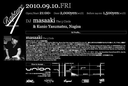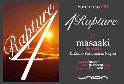 UNIONが自身を持ってお届けするMonthly House Music Party 「4Rapture」。 07年のUNION OPEN当初よりその内容を進化させ続けているPARTYであり、現在では多くのファンを獲得しているUNIONを代表するPARTYの一つとして人気を博している。 このPARTYのMAIN DJを務めるDJ masaakiのPLAYは、DEEP HOUSEを中心に現場で培った"本当に良い音楽"・"踊れる音楽"そして"人の記憶に残る音楽"を幅広くも膨大な音楽の中からチョイスし、フロアの反応に応じて目まぐるしく変化させて行く。 今現在大阪で最もオファーが多いHOUSE DJの一人である彼がメインDJとして、自らがプロデュースする「4Rapture」で最後の一曲まで音楽の共有を!!!!