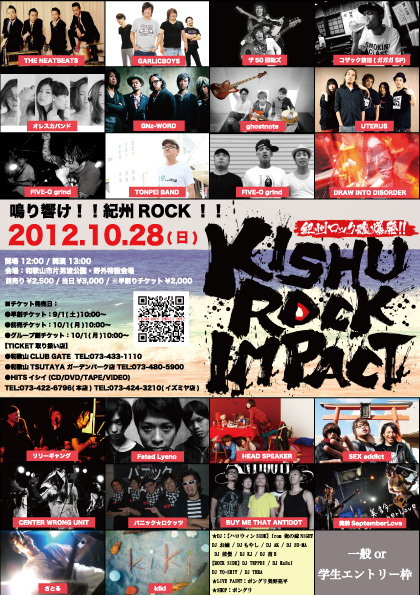 【CAST】>現在24組のアーティオストが和歌山に集結!! THE NEATBEATS/GARLICBOYS(大阪)/コザック前田(ガガガSP/神戸) ザ50回転ズ(大阪) /ゴーストノート(岡山)/オレスカバンド(大阪) ユウテラス(東京)/GNz-WORD(大阪)/FIVE NO RISK(大阪) 美鈴SeptemberLove(東京)/FIVE-O grind/DRAW INTO DISORDER Fated Lyeno/HEAD SPEAKER/リリーギャング/TONPEI BAND SEX addict/CENTER WRONG UNIT/パニック★ロッケツ BUY ME THAT ANTIDOTE/さとる/kiki/北田ようすけ 一般or学生エントリー枠and more.. アーティスト最終発表は近日!!HPをチェック!!