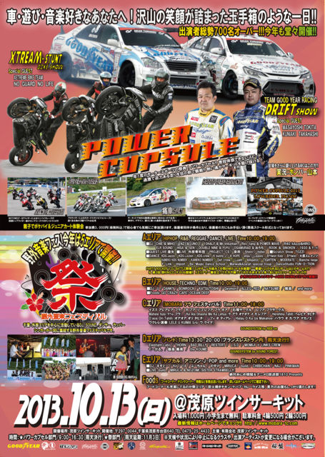 ------------------------------------------------ パワーカプセル部門(モータースポーツ) ・雨天決行 ・TIME 9:00-17:00 ■SpecialGUEST#1 高橋 邦明選手、時田 雅義選手 GOOD YEAR RACING Drift Show