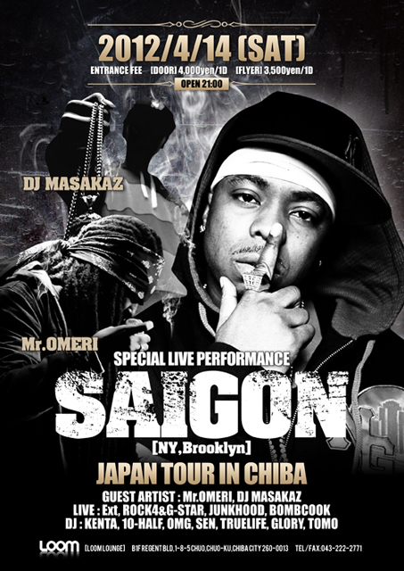 2012年4月14日、千葉LOOM LOUNGEにNYはBrooklynから敏腕プロデューサーJust Blazeの秘蔵っ子、今後確実にシーンの核となる正真正銘のリアルMC、SAIGON登場!!