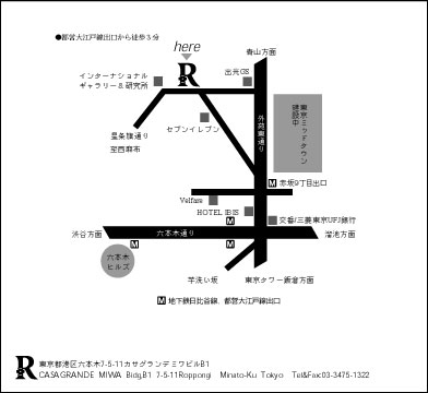 6/1/2006 (Thurs) admission: free time: from 10pm~late @ R. 住所:港区六本木7-5-11、カサグランデミワ・ビルB1 tel/fax: 03-3475-1322 MORE INFO:www.r-tokyo.com 行き方:六本木の交差点/駅から青山1丁目方面に外苑東通りに行き、(右に東京ミッドタウン)出光GS(左)にあり、左折。星条旗通り(真直ぐ行くと、西麻布、カオタン・ラーメンに出る道)に入り、インターナショナル・ギャラリー&研究所(という敷地が拾い場所)の手前、右手に中華料理屋があり、奥にP's Magicというハンバーガー&サウンドウィッチ屋があり、その手前のビルの地下1階、左手に階段が下れば、Rは地下1階にある。旧六本木のインク・スティックの跡地。。