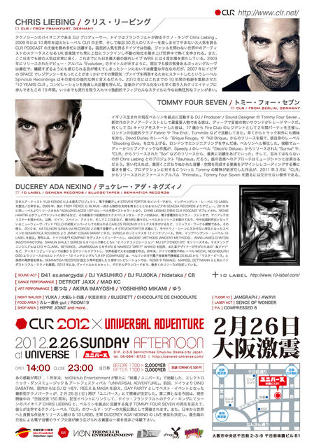 昨年末、 teiONclub Entertainment が新たに「味園 / ユニバース」で始動した、 エレクトロニック・ダンスミュージック & アートフェスティバル『UNIVERSAL ADVENTURE』。 前回、ドイツより DINO SABATINI 、国内からは DJ Q'HEY 、 REE.K & MASA を迎え、デイパーティとしてベストイベントとなった最新型テクノパーティが、2月26日 (日) 再び「ユニバース」にて開催が決定した。