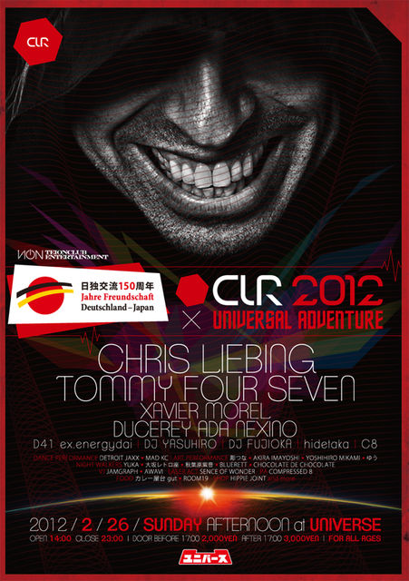 第二弾となる今回は、現在開催中の『日独交流150周年』記念イベントにリンクして、 ドイツ・フランクフルトのテクノ・キングにしてシーンのパイオニア CHRIS LIEBING と、 ベルリンを拠点に活動する鬼才 TOMMY FOUR SEVEN の両名を迎えて、 彼らが主催する『CLR』のワールドツアーの大阪公演として開催されます。