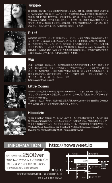 Music From Outa Space (仮の名前です。) 元Sui CreationのKickが、もっとJazzを、もつとLatinBeatを、もっとSpritsを…もっとExperimentalに…との思いでメンバーを集結させる。今回が最初のライブアクト! キーボードにはKickが約10年前コイツしかいない!と運命的に出会った最高のRhodesプレイヤーYoshida。ティンバレスは5年間キューバで逃亡生活を送っていたEnami。Drumには実はJazzオタクのMgovaのYutaka。ベースは元Sui Creationの同士でフレットが嫌いなベーシストAme。ギターは元Drawerのしいたけ。もう一人ギターでMuffのマー君。そしてパーカッションにHard Working Man! StroboのRyudai。※Howsweet Webに音源アリ。