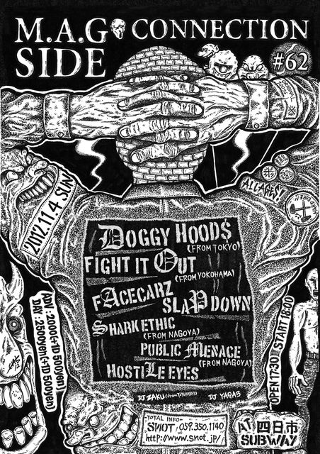 コメント 今回は、東京からH8MONGER氏率いるDOGGY HOOD$が四日市初登場!そして、今かなりの勢いでライブを敢行しているFIGHT IT OUTも久々にやってきてくれます!名古屋からもBLOODAXE FESTでその存在感を知らしめたSHARK ETHICと、最近勢いのある活動が目立つPUBLIC MENACEが出演!三重勢もこないだのM.A.G SIDE x ROCKOUTで怒濤のライブを披露したFACECARZと、SLAPDOWNも参戦!そして、三重県若手ビートダウンスラミンデスバンドHOSTILE EYESも初出演、若干19才のメンバーからなるこのバンドかなり期待大!凄い音してます!w DJ陣も久しぶりに豊橋からDJ ZAKU、SLAPDOWNからDJ YAGA3とかなり濃〜い夜となるので、みなさん是非遊びに来て下さい!!!