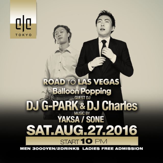 <女性入場無料> 黄金の街ラスベガスをコンセプトELE TOKYOが様々なショータイムと共に織り成す本場さながらの特別なラスベガスナイトに、コメディアンでもあり、韓国では知らない人はいない国民的スーパースターDJ G-PARK (パクミョンス) と、DJ Charlesがスペシャル出演! 音楽家/歌手として、これまでにBIG BANGのG-DRAGON、AFTER SCHOOLのリジ、少女時代のジェシカなどとコラボレーションをし、数々のヒット曲をリリース、EDM系のDJ G-PARKとして世界的規模の音楽フェスティバルULTRA KOREAには3年連続出演、ULTRA JAPANにも出演を果たしている彼らのプレイをお楽しみいただけます。 Ultra Japan - DJ G.PARK (박명수) #박명수 https://www.youtube.com/watch?v=xiH3WDKJtyM *************************************** 22:00〜23:00にご来場のお客様は 男女共エントランスフリー& 女性にはフリードリンクご優待。(24時まで) シェフ特製パーティーフードが無料サービス *************************************** 本場のEDMとポールダンス、ウォーターショーまでアメリカ別注のLED空間でオープンからラストまで全ての時間で繰り広げられるショータイムと演出で息つく暇もないステージと黄金の紙吹雪が舞う昇天のダンスフロアを堪能ください。 8月は大好評の"Balloon Popping"をテーマにした非日常の夜をお楽しみいただけます。 *************************************** EDM, Pole dance, and water show will be on stage at all time from open to end in LED Space that ordered specially. Have a wonderful time in the dance floor of fluttering golden confetti. ==================================== ELE TOKYO "Road to Las Vegas"〜Balloon Popping〜 START 10PM 22:00-23:00 MEN ADMISSION FREE LADIES ADMISSION FREE& FREE DRINK(till12am) 男女入場無料&女性フリードリンクご優待(24時まで)