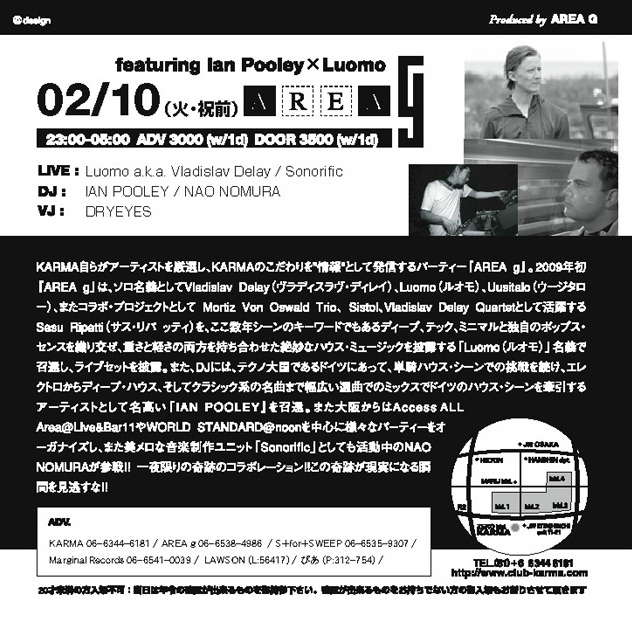 "KARMA自らがアーティストを厳選し、KARMAのこだわりを""情報""として発信する パーティー『AREA g』。2009年初『AREA g』は、ソロ名義として Vladislav Delay(ヴラディスラヴ・ディレイ)、Luomo(ルオモ)、Uusitalo(ウージタ ロー)、またコラボ・プロジェクトとして Mortiz Von Oswald Trio、 Sistol、Vladislav Delay Quartetとして活躍するSasu Ripatti(サス・リパ ッティ)を、ここ数年シーンのキーワードでもあるディープ、テック、ミニマ ルと独自のポップス・センスを織り交ぜ、重さと軽さの両方を持ち合わせた絶 妙なハウス・ミュージックを披露する『Luomo(ルオモ)』名義で召還し、ラ イブセットを披露。また、DJには、テクノ大国であるドイツにあって、単騎ハ ウス・シーンでの挑戦を続け、エレクトロからディープ・ハウス、そしてクラ シック系の名曲まで幅広い選曲でのミックスでドイツのハウス・シーンを牽引 するアーティストとして名高い『IAN POOLEY』を召還。また大阪からは Access ALL Area@Live&Bar11やWORLD STANDARD@noonを中心に様々なパーティ ーをオーガナイズし、また美メロな音楽制作ユニット「Sonorific」としても 活動中のNAO NOMURAが参戦!! 一夜限りの奇跡のコラボレーション!!この奇跡 が現実になる瞬間を見逃すな!!"