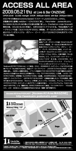 Access All Area@Live&Bar11 2009年5月21日 木曜日 時間: 22:00 〜 LATE 料金: 2,500yen/2d with flyer 2,000yen/2d ジャンル: HouseMusic
