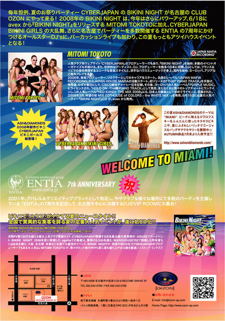 「BIKINI NIGHT-Nagoya」はレジデントDJに「MITOMI TOKOTO」を始め、 人気ファッションブランド 『ASH&DIAMONDS』 の08年最新ビキニをまとったセクシーなビキニガールズ達が大乱舞!するというPARTY!!!