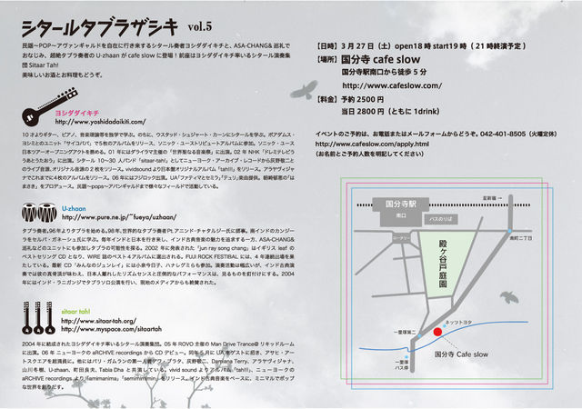 ☆U-zhaan タブラ奏者。96年よりタブラを始める。98年、世界的なタブラ奏者Pt.アニンド・チャタルジー氏に師事。南インドのカンジーラをセルバ・ガネーシュ氏に学ぶ。毎年インドと日本を行き来し、インド古典音楽の魅力を追求する一方、ASA-CHANG&巡礼などのユニットにも参加しタブラの可能性を探る。2002年に発表された「jun ray song chang」はイギリスleafのベストセリングCDとなり、WIRE誌のベスト4アルバムに選出される。FUJI ROCK FESTIBALには、4年連続出場を果たしている。最新CD「みんなのジュンレイ」には小泉今日子、ハナレグミらも参加。演奏活動は幅広いが、インド古典演奏では彼の真骨頂が味わえ、日本人離れしたリズムセンスと圧倒的なパフォーマンスは、見るものを釘付けにする。2004年にはインド・ラニガンジでタブラソロ公演を行い、現地のメディアからも絶賛された。