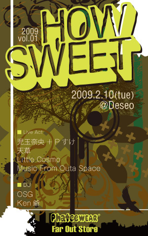 【Music From Outa Space (仮の名前です。)】 How sweet主催、元Sui CreationのKickが、もっとJazzを、もつとLatinBeatを、もっとSpritsを…もっとExperimentalに…との思いでメンバーを集結させる。今回が最初のライブアクト! キーボードにはKickが約10年前コイツしかいない!と運命的に出会った最高のRhodesプレイヤーYoshida。ティンバレスは5年間キューバで逃亡生活を送っていたEnami。Drumには実はJazzオタクのMgovaのYutaka。ベースは元Sui Creationの同士でフレットが嫌いなベーシストAme。ギターは元Drawerのしいたけ。もう一人ギターでMuffのマー君。そしてパーカッションにHard Working Man! StroboのRyudai。