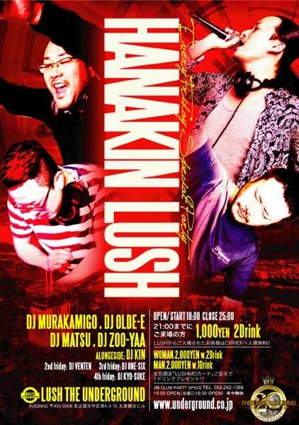 19:00 START WOMAN.2,000YEN(2D) MAN.2,000YEN(1D) OPEN-21:00まで1,000YEN(2D)! さらに女の子はLUSHMO提示で終日1Dプラス! つまり21:00までならLUSHMO持った女の子は1,000 YENで3D! ドリンクチケットでフードも頼めます! genre: ALL MIX MUSIC by: DJ OLDE-E/ DJ MURAKAMIGO/ DJ MATSU/ DJ ZOO-YAA/ DJ KIN/ DJ ONE-SIX info: 052-242-1388