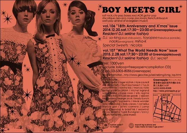 BOY MEETS GIRL vol.106 “18th Anniversary with X’mas” issue 2014.12.20.sat. 17:30 〜 23:00 at Greenapple(koenji) Resident DJ / sekine toshiya DJ/ so-king(klub shibuya-k),toyopee(fabulous parade),naoki(evergreen),miha-k Special Sweets / nicolas