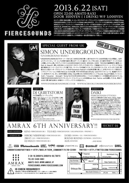 2013/06/22 Sat FIERCESOUNDS @ AMRAX Tokyo AMATE-RAXI, 3-26-16, SHIBUYA, SHIBUYA-KU, TOKYO, JAPAN TEL : 03-3486-6861 http://www.amrax.jp Door 3500 yen / WF 3000 yen 22:00 ~ 05:00