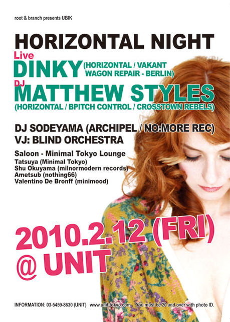 2.12 (FRI) @ 代官山 UNIT root & branch presents UBIK HORIZONTAL NIGHT featuring Live: DINKY (HORIZONTAL / VAKANT / WAGON REPAIR - BERLIN) DJs: MATTHEW STYLES (HORIZONTAL / BPITCH CONTROL / CROSSTOWN REBELS) and DJ SODEYAMA (ARCHIPEL / NO:MORE REC) VJ: BLIND ORCHESTRA Saloon: Minimal Tokyo Lounge - Tatsuya (Minimal Tokyo), Shu Okuyama (milnormodern records), Ametsub (nothing66), Valentino De Bronff (minimood)