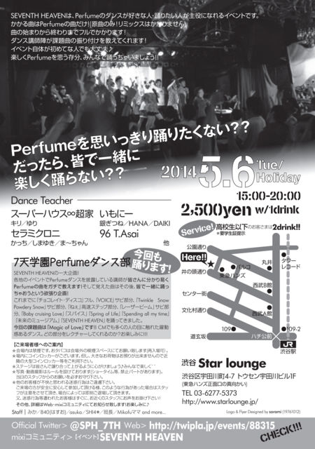 タイム テーブル 15:00-15:15:Opening / DJ:840 15:15-16:00:フリコピフリータイムPart 1 ※ Perfumeのみを頭から最後までフルがけします。 16:00-16:15: お客様参加企画 第2弾 ! ※スポットライト浴びてステージ独り占めTime! 16:15-16:55:フリコピフリータイムPart 2 ※ Perfumeのみを頭から最後までフルがけします。 16:55-17:10: Show Time Part 1 - 超いも(仮) 17:10-18:10: 7天学園Perfumeダンス部 <課題曲> Magic of Love 18:10-18:50: フリコピフリータイムPart 3 ※ Perfumeのみを頭から最後までフルがけします。 18:50-19:05: Brake Time 19:05-19:20:Show Time Part 2 - セラミクロニ 19:20-20:00フリコピフリータイムPart 4 ※ Perfumeのみを頭から最後までフルがけします。 フリータイムの楽曲は、当日のお楽しみにさせて頂きます!!!