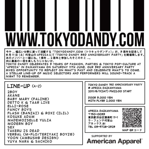 WE ARE CELEBRATING the 3rd ANNIVERSARY of TOKYO DANDY, SATURDAY JUNE 11TH at AFRICA in DAIKANYAMA! We have a cast of friends to help with proceedings, each of whom we have worked with in some way over the past 3 years, each of whom has grown in their own way. We have chosen AFRICA as we want a space with a tall ceiling where people can really let go and DANCE DANCE DANCE whilst also offering a lounge space for those quieter souls who are happy to sit back and drink with friends. This night will bring together an eclectic mix of high fashion players, street style icons and bright shining super stars. Each and everyone plays a part in this community and on Saturday June 11th we invite you to celebrate with us.