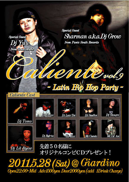 CALIENTE VOL.9 〜LATIN.HIP HOP PARTY〜 2011 5.28.(SAT) OPEN 22:00〜MID @GIARDINO ADV \1500(1D) DOOR \2000(1D)