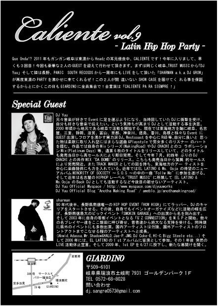 Que Onda!? 2011年もガンガン岐阜は東濃からHeadzの耳元侵食中、CALIENTEです!今年に入りまして、早くも3回目!今回も豪華な2人のGUESTを迎えて行わせて頂きます。まずは同じ岐阜、TRUST MUSICから「DJ Yuu」そして隣は長野、PANIC SOUTH RECOSDSから一周年にもLIVEをして頂いた「SHARMAN a.k.a.DJ GROW」が再度東濃のPARTYを沸かせに来てくれるぜ!この2人が間違いないSHOW CASEを届けてくれる事を保証するからとにかくこの日もGIARDINOに全員集合で!合言葉は「CALIENTE PA RA SIEMPRE!」