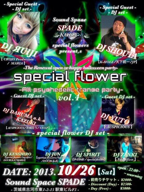 special flowers CrewのAll Psychedelic Trance Party 【special flower】前回の開催で見事220人overを記録したあのMONSTER PSY PARTYがついに新店舗Spadeにて10月26日に開催します!!
