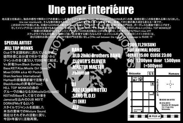 地元富士を拠点に、独自の感性で静岡エリアの音楽シーンを盛上げて来たBigDady、4D-POCKETことDORA氏がこの度、結婚を期にこの街を離れる事になりました。 Une mer intérieureは、そんな彼の旅立ちを祝い、ジャンルの壁を超え様々な音楽を愛し、精通してきた彼の集大成をも言える一夜です。 この日のフロアを揺らす為、日頃からDORA氏と親交の深い様々なジャンルのアーティスト達が集結!!!盟友の門出をボータレスな選曲で盛上げます。 そしてメインアクトはこの日の主役でもあるDORA、昇竜(MC)、KEITA(B)のそれぞれ異なる才能が集まったマボロシのユニット『HILL TOP MONKS』が一夜限りの再結成!! DJでもエンジニアでもないDORA氏を見る事が出来るのは、この夜だけかも?! ステレオタイプなものを嫌い純粋に『良い音』を愛する彼にちなんだオールジャンルの一夜…11月29日(イイニクの日)はあびるほどのお酒とGOOD MUZIKで彼の門出を祝いましょう!!!!!!!!!