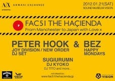 ジョイ・ディビジョン / ニュー・オーダーのオリジナルメンバーでハシエンダのドンである “ピーター・フック” と、バイブプロバイダーとして会場を盛り上げるハッピー・マンデーズの “ベズ” が、公認レジデントとなった sugiurumn 、2012年1月18日にミックス CD のリリースを控えた DJ KYOKO と共に、渋谷の夜をロックする。