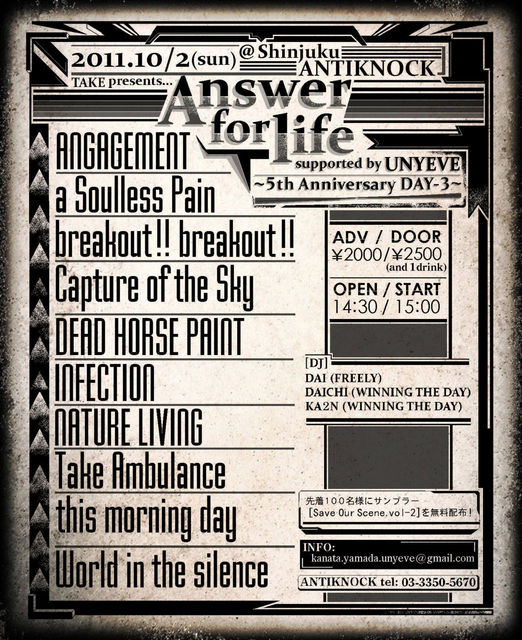 10/2(SUN) 新宿ANTIKNOCK(http://www.antiknock.net/) TAKE presents... [Answer for life suported by UNYEVE〜5th Anniversary DAY-3〜]