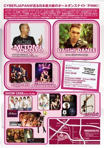 CYBERJAPANが送る日本最大級のポールダンスナイト『PINK!』MITOMI TOKOTO & DAISHI DANCE のオールナイトプレイに加え、PINK FORCE xCYBERJAPAN DANCERS のコラボレーション・ショーを披露。今回はセクシーナースにセクシー女医が大活躍という面白ショーにご期待下さい!さらに、日本各都市のポールダンサーグループのショーケースを開催。新たなダンサー達が数々の力作を発表します!終電前の時間のショーケースをご覧の方は再入場も可能(※11PM 迄にご入場の方のみ)ショーを彩るのは、『THAT IBIZA TRACK』が海外でも話題沸騰中の MITOMITOKOTO & ヒット街道驀進中の DAISHI DANCE がパワフルなプレイで競演!華麗なダンサー達と音楽のコラボレーションをお楽しみ下さい!