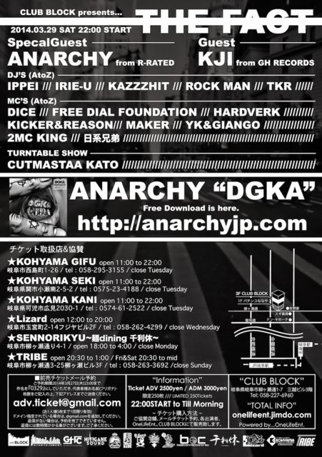 2014.03.29(sat) CLUB BLOCK presents… "THE FACT" at CLUB BLOCK ANARCHY "DGKA" ~DIRTY GHETTO KING ANARCHY~ RELEASE TOUR START/PM 10:00(23:00) to TillMorning