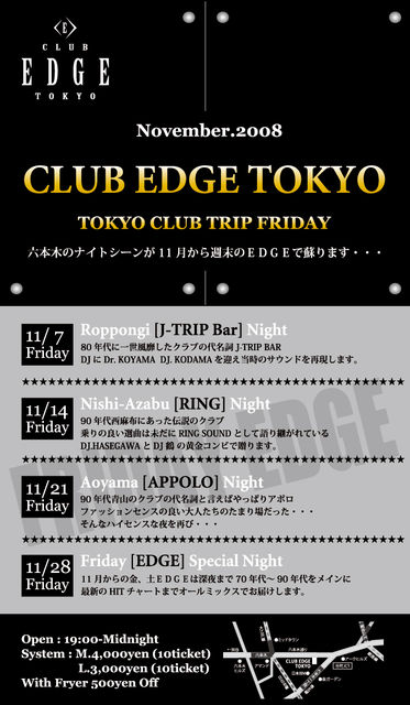 六本木 CLUB EDGEでは11月より週末はオールナイト営業となります。