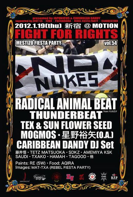 MANU CHAO、FERMIN MUGURUZA、NATHEN MAXWELL (FLOGGING MOLLY)、BRAHMAN、KING PRAWN (ASIAN DUB FOUNDATION)、ESNE BELTZA、VERY BE CAREFUL等の全世界で活躍するアーティストの出演で話題の『FIGHT FOR RIGHTS』。前回名古屋で行われた『FIGHT FOR RIGHTS』にMANU CHAOが出演し、入場規制がおきる程の盛り上がりを見せた事も記憶に新しいのでは?90年代から日本にROCK LATINO、CUMBIA、MESTIZOミュージックを紹介し続けているJAPONICUSが始めた、本邦初のREBEL MUSICイベントである。そんな『FIGHT FOR RIGHTS』に、バルセロナのエレクトロ・ストリート・サウンドRADICAL ANIMAL BEATが登場! そして日本のレーベル・ミュージック・シンを代表するCARIBBEAN DANDY、THUNDERBEAT、TEX & SUN FLOWER SEED、MOGMOS等の唯一無二とも言える個性的なLIVEパフォーマンスも見逃せません!日本で本物のMESTIZOが聴けちゃいます!