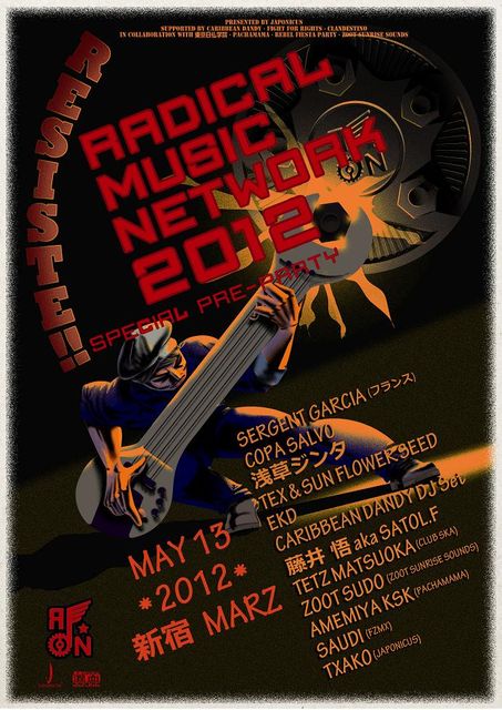 RICO RODRIGUEZ、LAUREL AITKEN、FERMIN MUGURUZA、こだま和文、BRAHMAN、ESNE BELTZA、VERY BE CAREFUL、THE ZOOT 16、TURTLE ISLAND等の伝説的アーティストの出演で話題のRADICAL MUSIC NETWORK。日本にはない新しいREBEL MUSICという音楽の種を植えたい!とJAPONICUSが始めた日本のREBEL MUSICの草分け的イベントである。過去にはFERMIN MUGURUZAとTHIN MAN (痩人)を迎えて中国でも開催され、2009年にはTURTLE ISLANDと共にバスク公演を実現させ大きな反響を呼んだ。さらに2009年には、フジ・ロック・フェスティバルでのイベント開催を決行。新鮮な驚きと興奮で、クリスタル・パレスは一時入場制限が出たほどの盛り上がりを見せた。そんなRADICAL MUSIC NETWORK SP Pre-Partyに今回フランスの伝説バンドSERGENT GARCIAが再参戦!ROCK LATINO、SALSA-MUFFIN、CUMBIA、MESTIZO、PACHANGAという数年前までは殆ど知られていなかった音楽ジャンルだが、今ではレコード店や雑誌がこぞってMESTIZO特集を組むほど人気が上がっている。この現象は、SERGENT GARCIAの来日が大きく影響している事は明らかだろう。今回のRADICAL MUSIC NETWORK SPは「MESTIZO FIESTA PARTY」で、思う存分ROCK LATINO・CUMBIAをはじめとするMESTIZO (混血)音楽を楽しめる企画になっている。何が起こるかわからない!?日本のCARIBBEAN DANDY、浅草ジンタ、EKD、COPA SALVO、TEX & SUN FLOWER SEED等の刺激的な実力派アーティストの共演にも注目です!