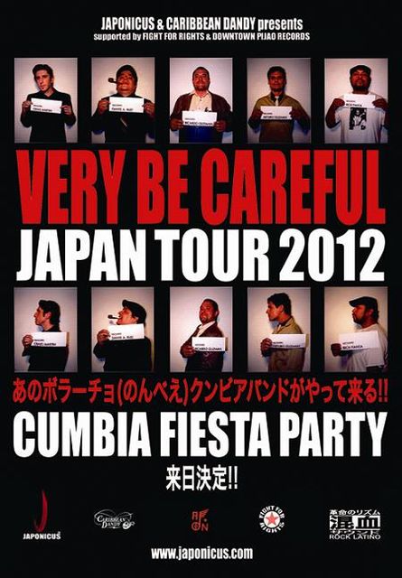 VERY BE CAREFUl (profile) THE CLASHのジョーストラマーが惚れ込み、自身のLIVEの前座に起用した事でも知られるCUMBIAバンド、VERY BE CAREFUL。2007年の朝霧ジャムでクロージングアクトを務め、朝霧アリーナをVERY BE CAREFULワールドに巻き込む、ヘッドライナーに相応しいLIVEを披露。その時の記憶が脳裏に焼きついているファンも多いのではないだろうか。L.Aのストリートからバンドをスタートした彼ら。CUMBIA、VALLENATO等のカリビアンルーツミュージックを、カフェ、電車内、ビーチ、ハロウィンパーティーや結婚式場等、あらゆる場所で演奏。10年以上の地道な活動が口コミで広がり、カリフォルニアのラジオ、アルゼンチン、メキシコのクンビアシーンでヒットを飛ばすようになった。L.A育ちの彼らが、何故ここまで人の心を揺さぶる演奏が出来るのか?答えは彼らのルーツと家族にある。コロンビアの移民の子であるVERY BE CAREFULは、父や母、親戚と共にカリビアンルーツミュージックを聴きながら育ち、やがて自らも演奏するようになった。それを家族は誇りに思い、支えた。VERY BE CAREFULのアルバムは、ジャケットで父の写真が使われていたり、母が書いた歌詞を歌っていたりするが、そういった彼らの行動ひとつひとつに家族の絆を感じずにはいられない。間違いなく、それが彼らの音楽活動の基礎になっているのだろう。そんなVERY BE CAREFULの二年ぶりの再来日公演が決定した。過去にはJOE STRUMMER、DUB TRIO、CARLOS VIVES、GOGOL BORDELLO等の実力派アーティストと共演。日本では、こだま 和文、THE ZOOT 16、石川道久セッション、COPA SALVO、EKD、EL SKUNK DI YAWDIE、TURTLE ISLAND、THE BEACHES、SAN FERNANDO MENTO PATROL、浅草ジンタ等と共演している。また、2010年には日本のDJ集団、CARIBBEAN DANDYの米国ツアーを企画。L.Aで最も有名なラテンクラブLA CITA等を回り、大成功を収めた。これまでに、FIFA WORLD CUP ‘06、朝霧JAM、GLASTONBURY MUSIC FESTIVAL、CENTRAL PARK SUMMER STAGE、L.A SPORT ARENA CUMBIA FESTIVAL、FUJI ROCK FESTIVAL (2回)、RADICAL MUSIC NETWORK、FIGHT FOR RIGHTS等、世界中のフェスやイベントに出演。VERY BE CAREFULの余分なものを削ぎ落としたコロンビアの伝統的なビート。縦横無尽に駆け巡るアコーディオンの音色。歌って踊って呑んで笑える最強のCUMBIAバンドを生で体感しよう!